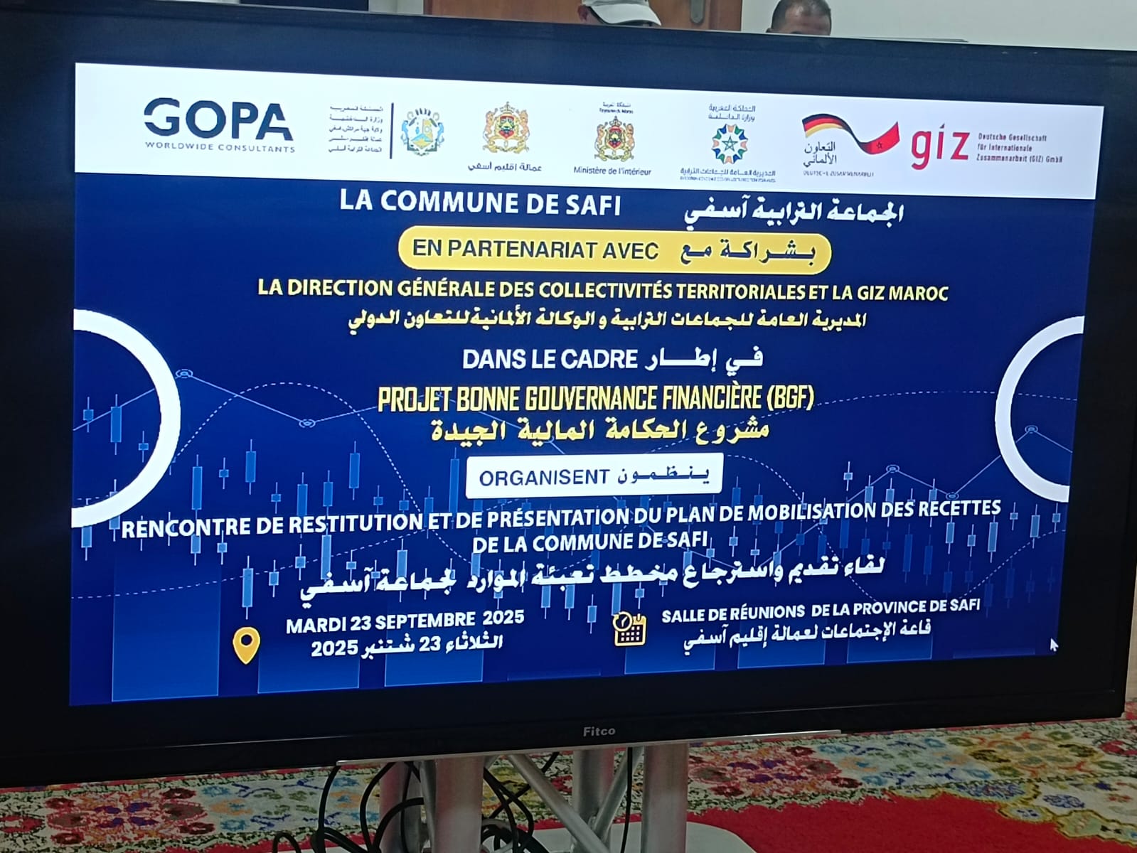 في إطار مشروع الحكامة المالية الجيدة (BGF)، وبشراكة مع المديرية العامة للجماعات الترابية بالمغرب والوكالــة الألمانيــة للتعاون الدولي (GIZ)، انعقد يوم الثلاثاء 23 شتنبر 2025 إبتداء من الساعة العاشرة صباحا، بقاعة الاجتماعات بعمالة آسفي، لقاء حول " تقديم واسترجاع مخطط تعبئة الموارد لجماعة آسفي"، وذلك عن طريق إشراك مختلف الفاعلين، مع التركيز على خطة تعبئة الموارد المالية الخاصة بجماعة آسفي.
